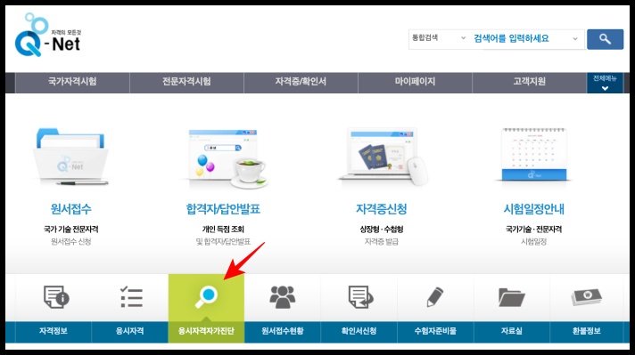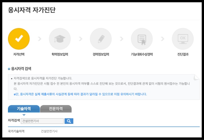 시험 접수 전 건설안전기사 응시자격을 정확하게 확인하고 싶으신 분은 큐넷 홈페이지에서 로그인 후 응시자격자가진단을 진행해 보실 수 있습니다. 방법은 아래 사진을 보고 진행해 주시면 됩니다.