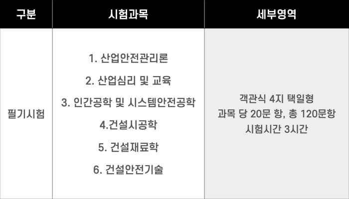 건설안전기사 필기시험과목은 총 6과목으로 1. 산업안전관리론, 2. 산업심리 및 교육, 3. 인간공학 및 시스템안전공학, 4. 건설시공학, 5. 건설재료학, 6. 건설안전기술로 구성되어 있습니다. 시험 문제 출제는 각 과목 당 20문제가 출제되며, 객관식 4지 택일형 방식입니다. 따라서 총 120문제가 출제되며, 시험시간은 3시간입니다.