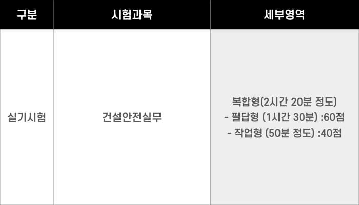 실기시험과목은 건설안전실무이며, 복합형 방식으로 진행되는데요. 복합형은 주관식 필답형 (1시간 30분) + 작업형 (50분 정도)으로 이루어져 있습니다. 각 배점은 필답형 60점, 작업형 40점입니다.